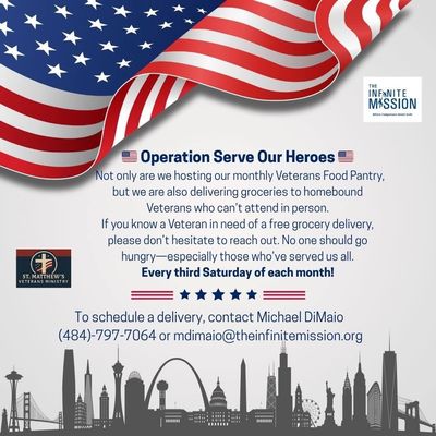 Operation Nourish a Veteran is an initiative to raise funds for local veterans in our community who are struggling with hunger. For more information don't hesitate to get in touch with mdimaio@theinfinitemission.org